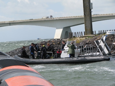 Vanaf het motorjacht waren de duikers, per groepje van 2, aan het duiken rond de pijlers van de Zeelandbrug.